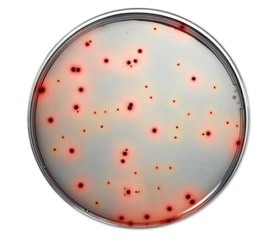 Colônias vermelhas de alto contraste para facilitar a identificação.